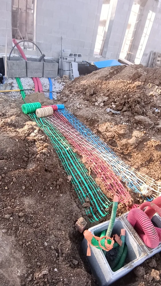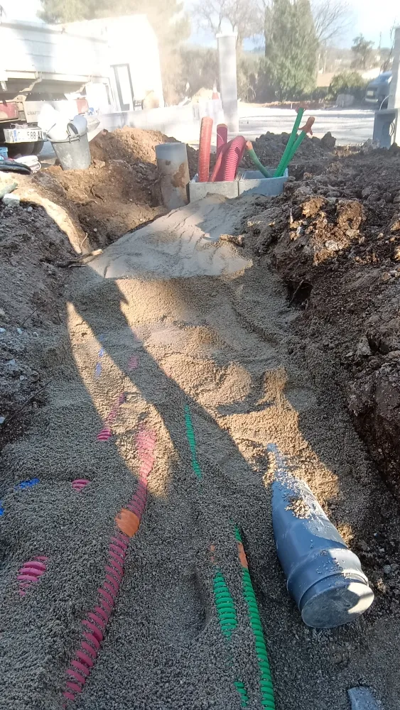 Votre entreprise de terrassement et d'assainissement à Draguignan a réalisé une tranchée pour y poser des réseaux secs et humides ( eaux usées AEP, électricité et télécom) tout cela enrobé de sable avec la pose de grillages avertisseurs et le remblaiement avec du sable et du 0/20 compactés par tranches de 30 cm et la pose de regards à chaque changements de directions.